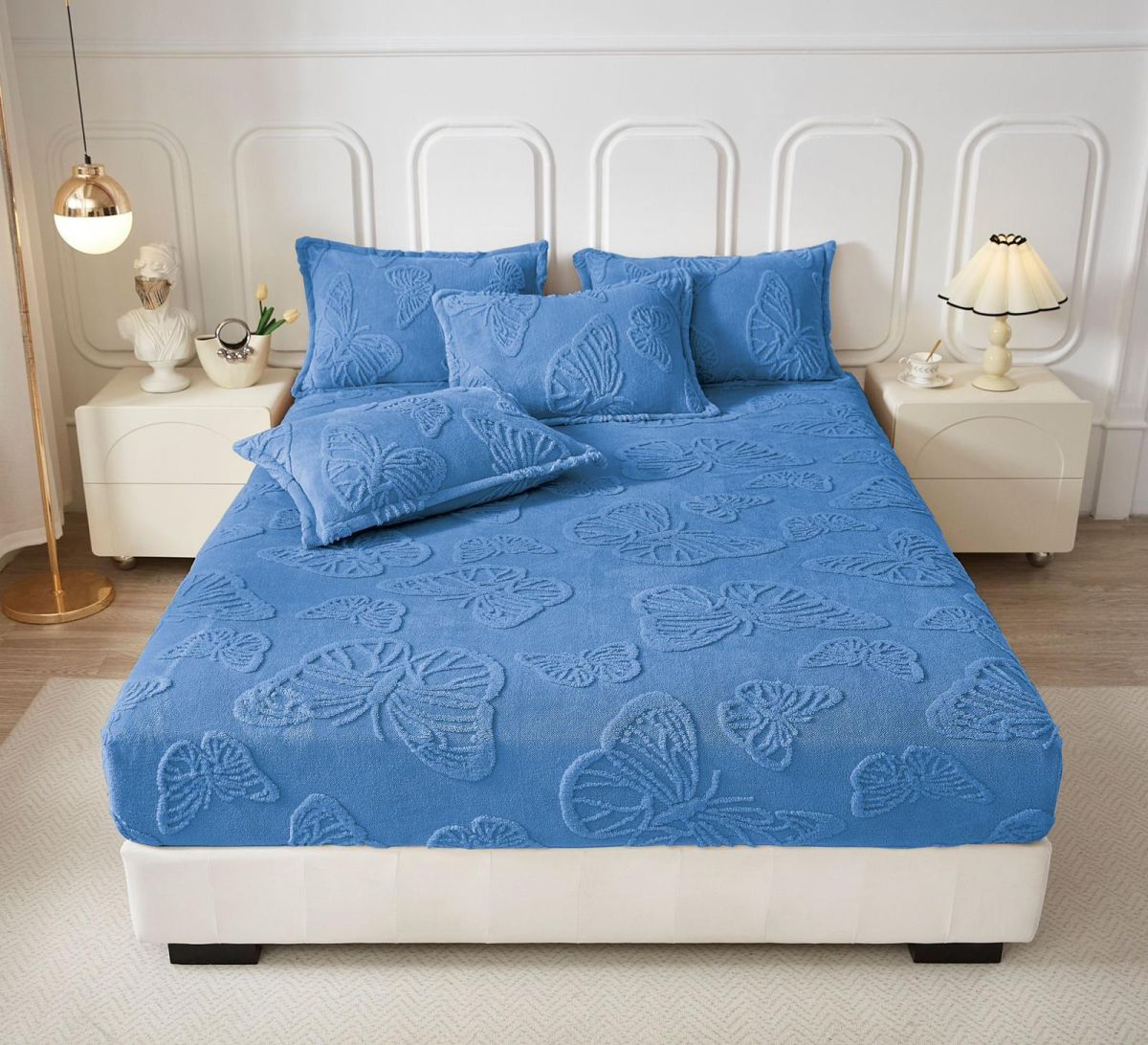 Husă de Pat Cocolino Albastru cu Elastic – Fluturi Reliefați, Set 3 Piese