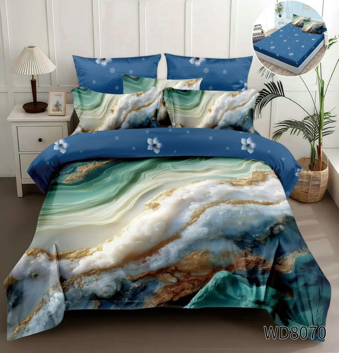 Lenjerie de pat dublu 4 piese finet, model marmură verde smarald cu accente aurii