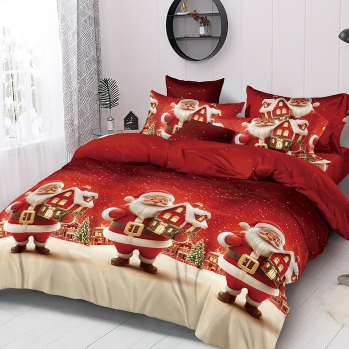 Înveselește-ți dormitorul în sezonul sărbătorilor cu această lenjerie de pat din finet premium 5D, cu imprimeu de Moș Crăciun pe fundal roșu, realizată din material moale și confortabil.