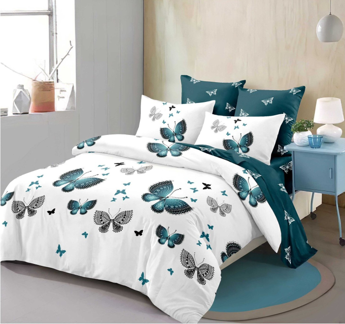 Adaugă un plus de eleganță și prospețime dormitorului tău cu această lenjerie de pat modernă, model cu fluturi turcoaz.