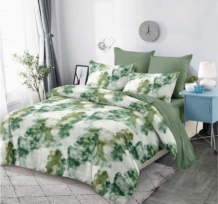 Transformă dormitorul într-un spațiu modern și relaxant cu această lenjerie de pat elegantă, model abstract în nuanțe naturale de verde.