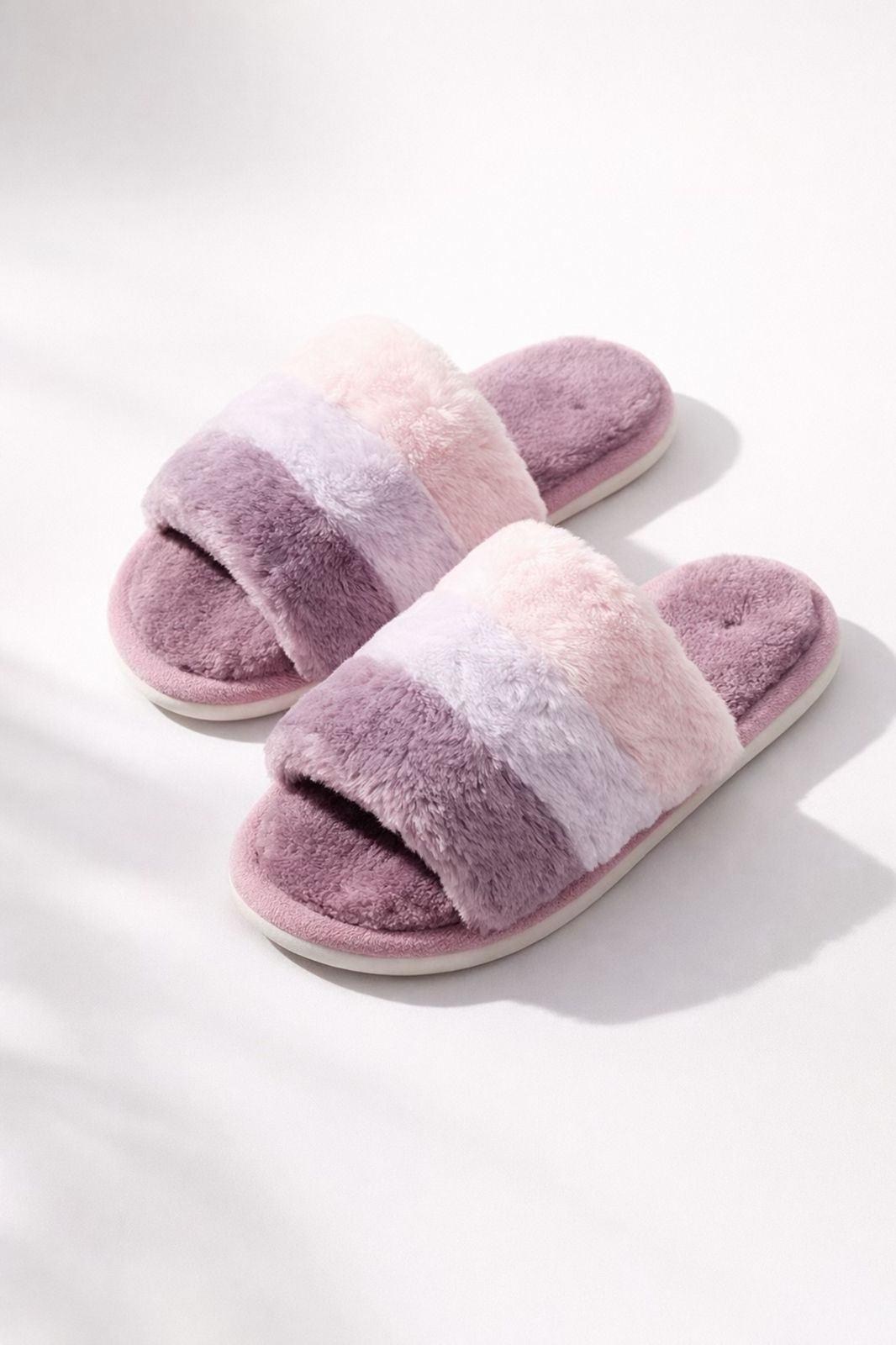 Papuci de casă damă AmaraHome, realizați din material pufos, extrem de moi și confortabili. Design modern în nuanțe delicate de mov, roz și lila.