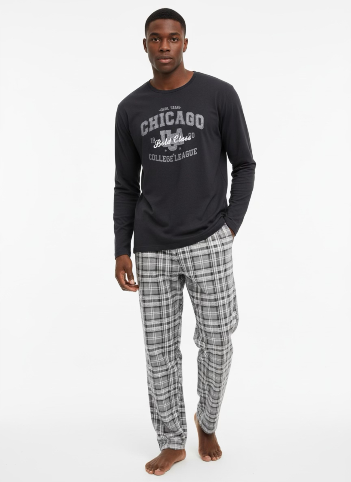 Pijama bărbați Chicago College League – Set 2 Piese, Bumbac Soft – Bluză neagră + pantaloni carouri