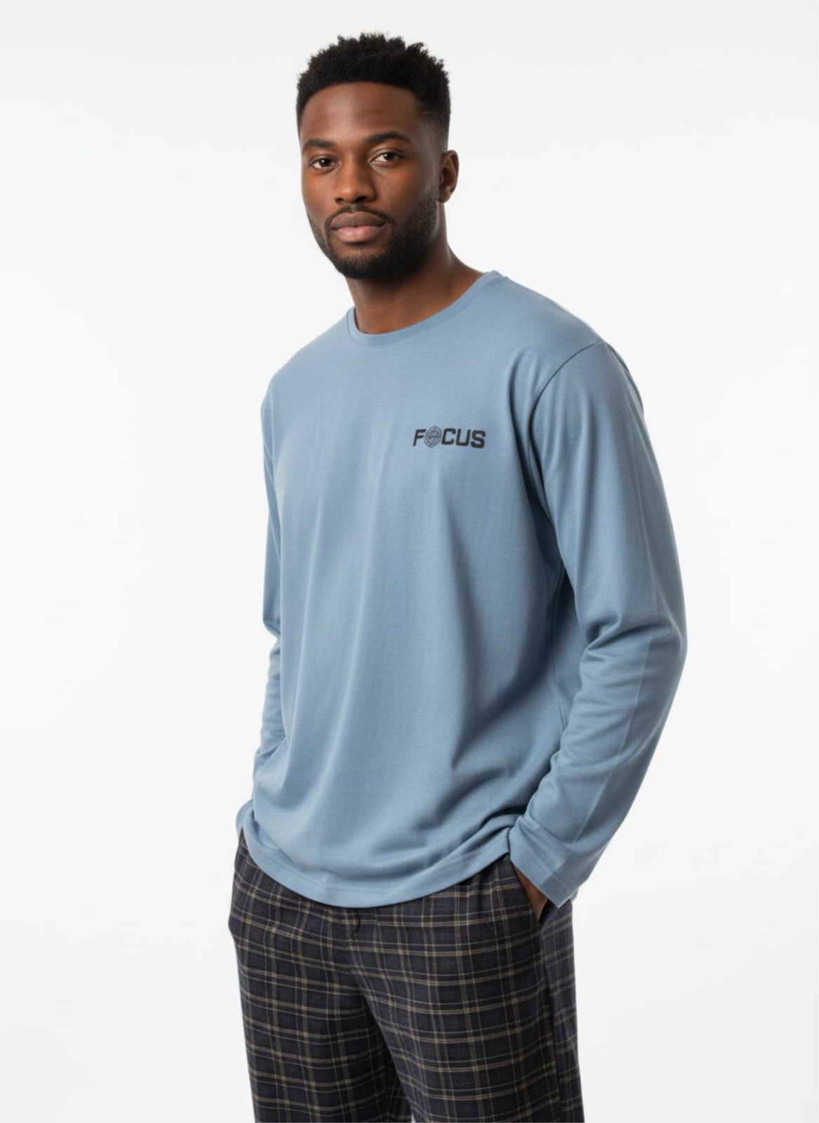 Această pijamă pentru bărbați Focus este alegerea ideală pentru serile liniștite și confortabile de acasă. Setul conține o bluză albastră cu mânecă lungă, realizată din material moale și plăcut pe piele, cu imprimeul discret „FOCUS”, potrivit pentru un stil modern și relaxat.
